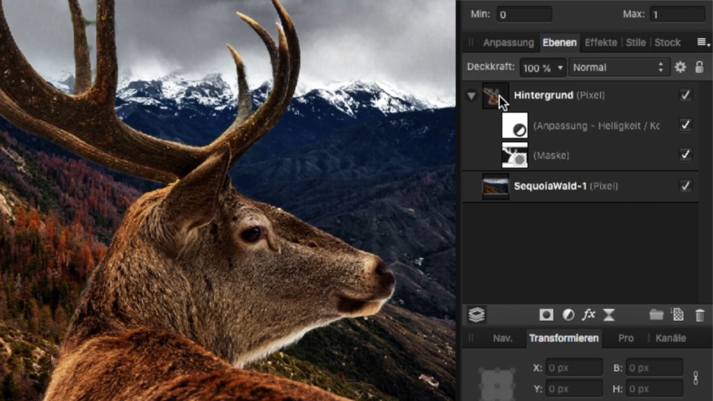 Um bestimmte Ebeneninhalte nun transparent zu machen, benutzt man sogenannte „Maskierungs-Ebenen“. Das sind Unterebenen von normalen Ebenen. Die untergeordnete Maskierungsebene selbst ist nicht sichtbar im fertigen Projekt. Allerdings wird alles was man in der Maskierungsebene schwarz einfärbt in der übergeordneten Hauptebene unsichtbar.