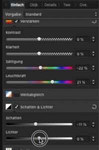 Über die Schieberegler auf der rechten Seite kann man hier schnell und einfach Anpassungen am gesamten Foto bewirken, indem man z.B. Kontrast, Sättigung oder Helligkeit verändert.