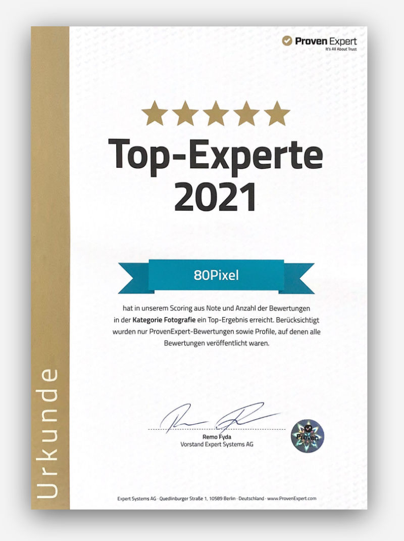Der Erfolg und die Zufriedenheit meiner Kunden, spiegeln sich auch in zahlreichen positiven Bewertungen wieder. Im Branchen-Check 2021 der renommierten Plattform “ProvenExpert” konnte ich mich daher unter den TOP-3-Experten der Branche “Fotografie” platzieren.