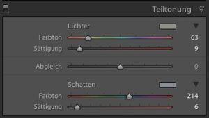 Wenn dir das zu kompliziert ist, bietet Lightroom mit der Funktion „Teiltonung“ eine gute Alternative. Hierüber kannst du den „Lichtern“ und „Schatten“ des Bildes einen zusätzlichen Farbton hinzufügen. Um die natürliche Lichtstimmung zu unterstützen fügt man den Lichtern also warme Töne wie gelb oder orange hinzu. Die Schatten erhalten hingegen kalte bläuliche Töne (siehe Bild).