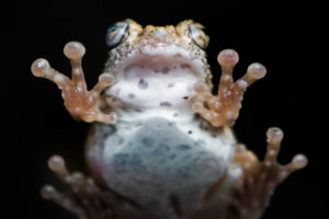 Frosch aus der Froschperspektive: Dieses Foto entstand in einem Zoo. Der Frosch klebt an der Scheibe seines Terrariums, während sich die Kamera auf der anderen Seite der Scheibe befindet.
