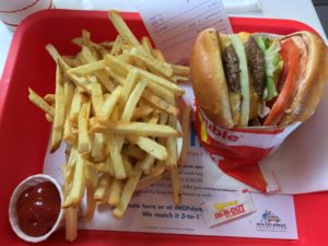 Im Gegensatz zu den meisten anderen Fast-Food-Ketten, bietet In—N-Out nur eine sehr kleine Speisekarte an. Diese wird aber zusätzlich durch das sogenannte „Secret Menu“ erweitert. Außerdem können Burger und Pommes nach Belieben mit weiteren Zutaten (auf meinem befindet sich z.B. eine ordentliche Portion extra Zwiebel) ergänzt werden. Vor allem aber schmeckt der Burger einfach gut! 🙂