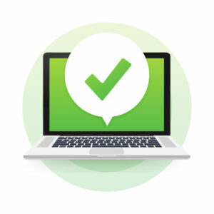 Laptop with checkmark or tick notification in bubble. Approved choice. Accept or approve checkmark. Vector illustration.