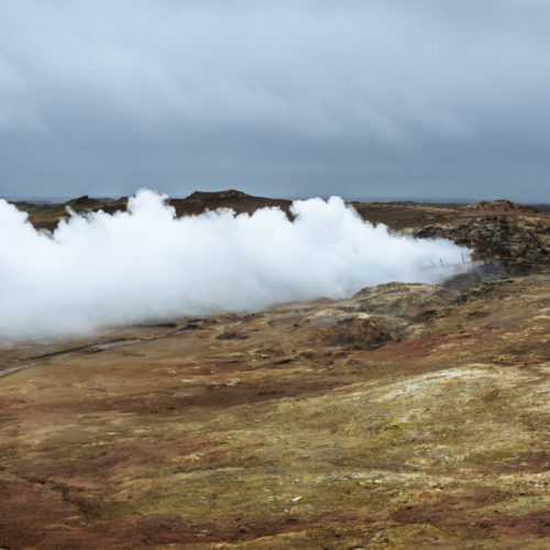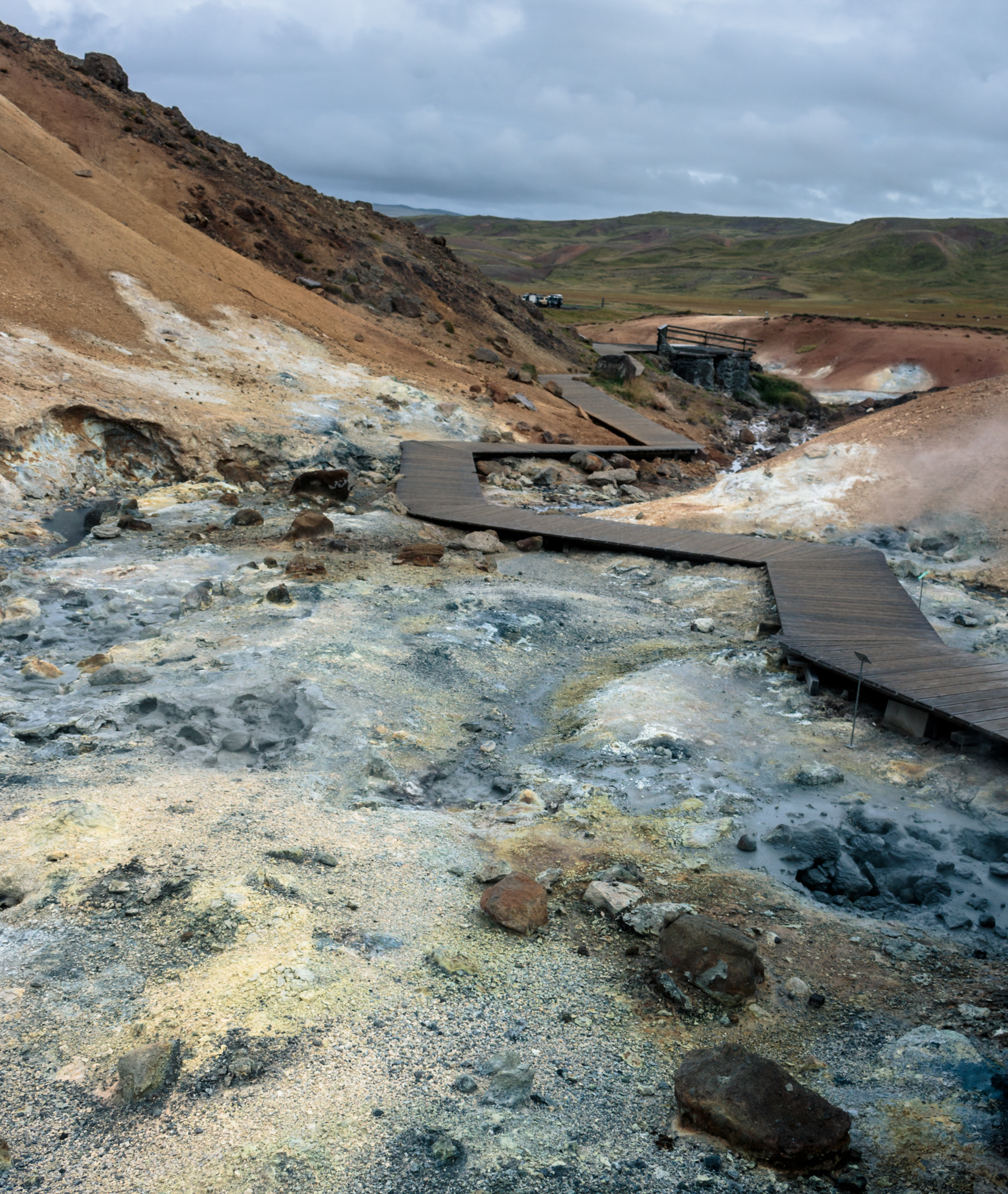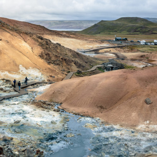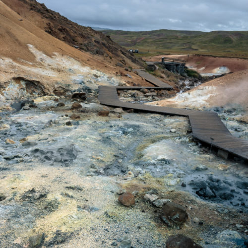 Nur einen Kilometer entfernt befindet sich jedoch das bekannteste geothermische Feld von Krysuvik: Seltun. Der kurze Spaziergang über die Wege und Plattformen durch die brodelnd dampfende Erde lohnt sich auf jeden Fall.