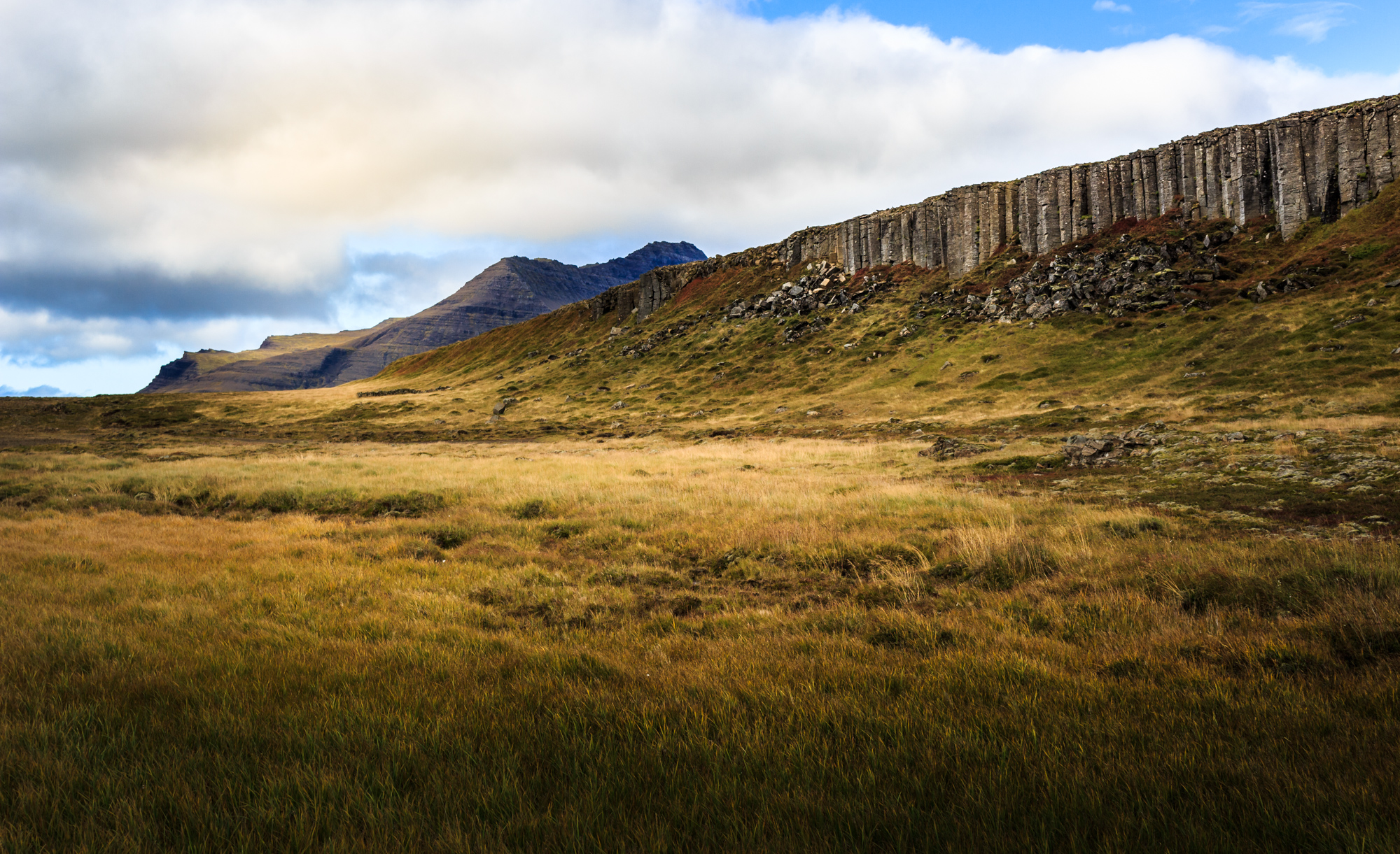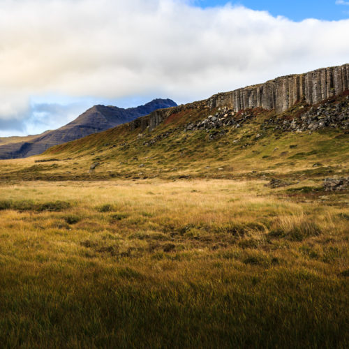 Die Basaltsäulen „Gerðuberg“ sind vor langer Zeit aus geflossenes basaltischer Lava entstanden und sehen fast wie eine von der Natur erschaffene Mauer aus. Die gleichmäßig geformten Säulen sind bis zu 14 Meter hoch und erstrecken sich über eine Länge von etwa 500 Metern.