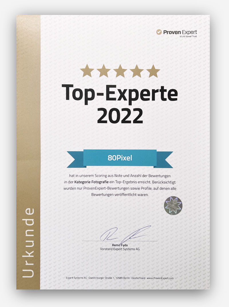 Der Erfolg und die Zufriedenheit meiner Kunden, spiegeln sich auch in zahlreichen positiven Bewertungen wieder. Im Branchen-Check 2022 der renommierten Plattform “ProvenExpert” konnte ich mich daher unter den TOP-3-Experten der Branche “Fotografie” platzieren.